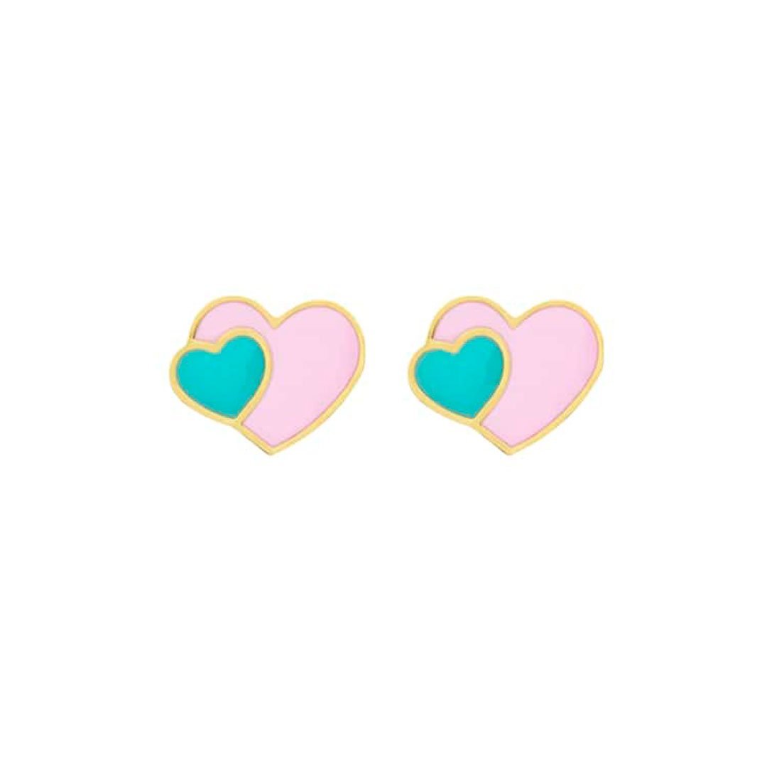 Brinco Infantil Dois Corações resinado rosa e verde agua. Semijoia banhada á ouro 18k revestida com uma camada exclusiva de verniz antialérgico.Para garantir mais segurança e conforto, todos os nossos brincos acompanham a tarraxa borboleta e a tarraxa baby.