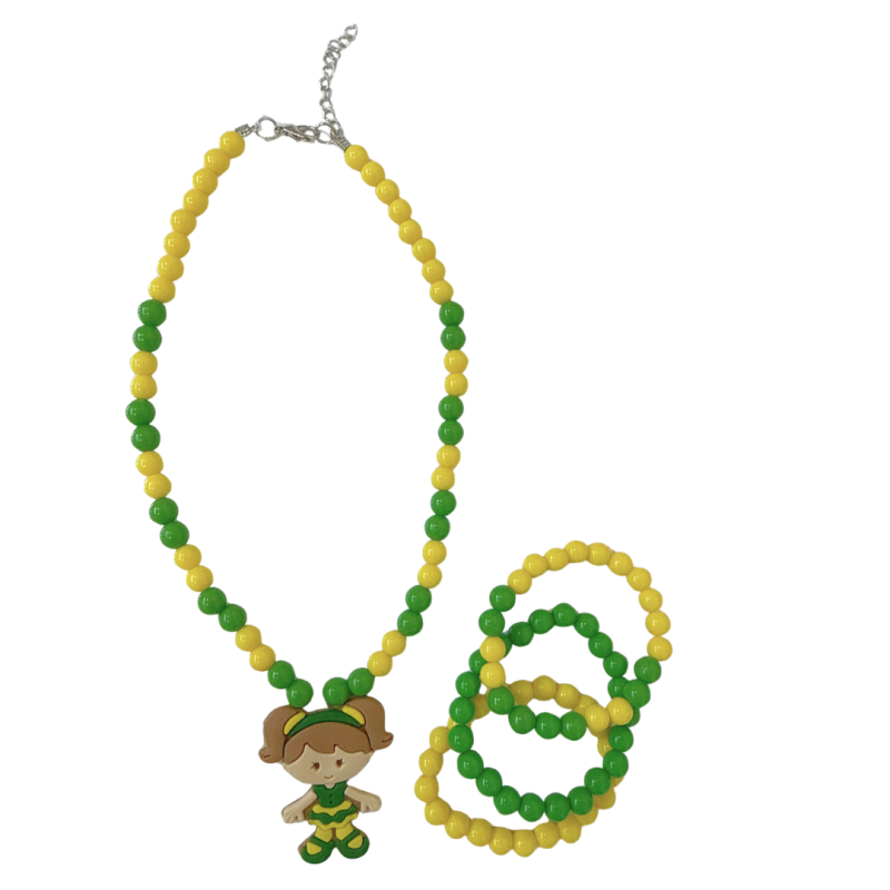 Encante as pequenas com esse lindo conjunto infantil composto por colar e pulseira em miçangas verdes e amarelas, com delicado pingente de menina. Um modelo alegre e cheio de charme, perfeito para meninas que adoram acessórios coloridos e divertidos. Leve, confortável e fácil de combinar, o conjunto é ideal para usar em festas, passeios, eventos escolares ou para torcer em grande estilo. As cores vibrantes trazem um toque especial e deixam o look ainda mais encantador. Uma ótima opção para presentear com carinho ou para revenda, garantindo excelente aceitação e ótimo custo-benefício. Um produto que encanta e chama atenção!