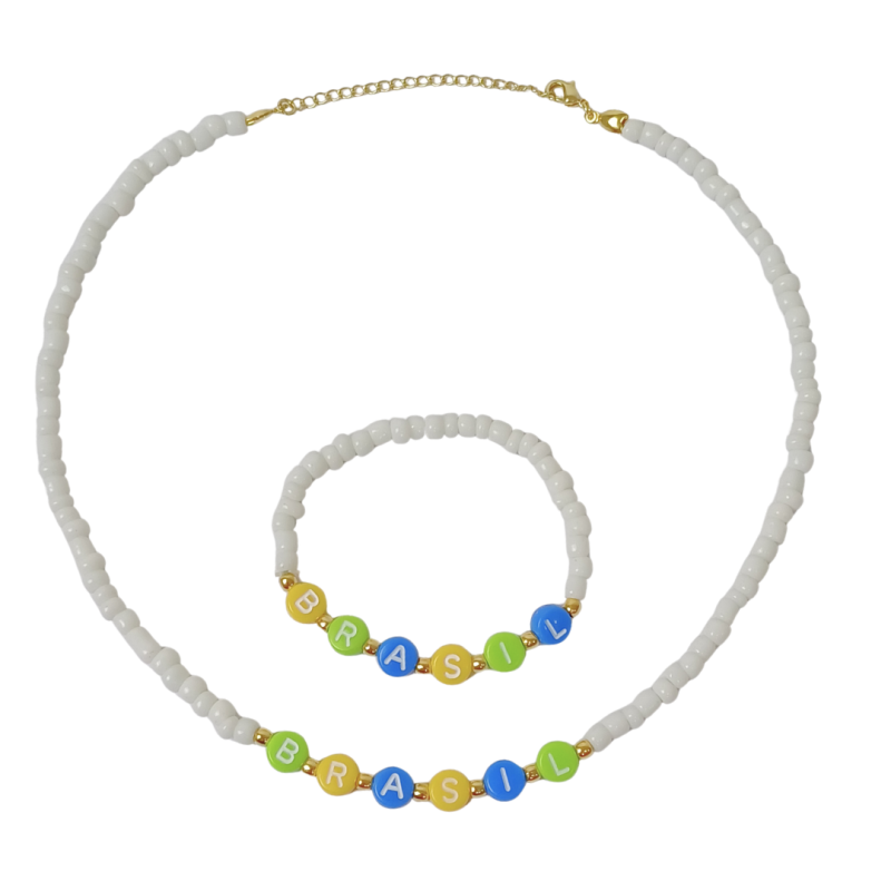 CONJUNTO INFANTIL COPA DO BRASIL – COLAR E PULSEIRA PERSONALIZADO “BRASIL”! Encante as pequenas com o Conjunto Infantil Copa do Brasil – Colar e Pulseira Personalizado “Brasil”, um acessório delicado e cheio de estilo. O colar é confeccionado com miçangas brancas e bolinhas em banho dourado intercaladas com a palavra “Brasil” personalizada, trazendo um charme especial à peça. Possui fecho em banho dourado com extensor, permitindo melhor ajuste no pescoço da criança. A pulseira acompanha o conjunto e conta com elasticidade, proporcionando conforto e encaixe perfeito no pulso infantil. Um conjunto leve, alegre e inspirado nas cores e na energia do Brasil, ideal para complementar o visual das pequenas. Perfeito para revenda, presentear ou compor looks temáticos com muito charme e delicadeza.