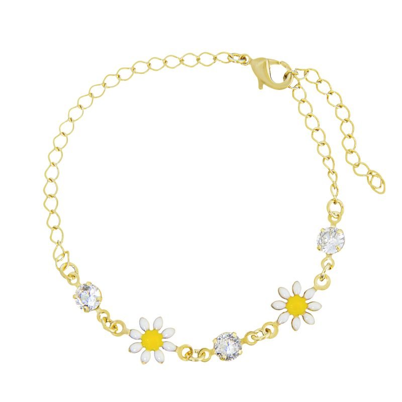 Pulseira Infantil Margarida adornada com pedrinha cravejada em zircônia cristal, banhada em ouro! Uma semijoia hipoalergênica, desenvolvida com todo cuidado e delicadeza, com florzinhas de margarida que trazem leveza, alegria e sofisticação na medida certa. Revestida com camada exclusiva de verniz antialérgico, a pulseira oferece conforto e segurança para o uso diário, além de garantir maior durabilidade e brilho prolongado à peça. Possui elo ajustável, permitindo melhor encaixe ao pulso infantil. Com 1 ano de garantia, é perfeita para presentear ou revender em grande estilo, sendo uma opção versátil que combina tanto com o dia a dia quanto com ocasiões especiais. Adquira esse verdadeiro encanto em forma de semijoia e encante quem você ama